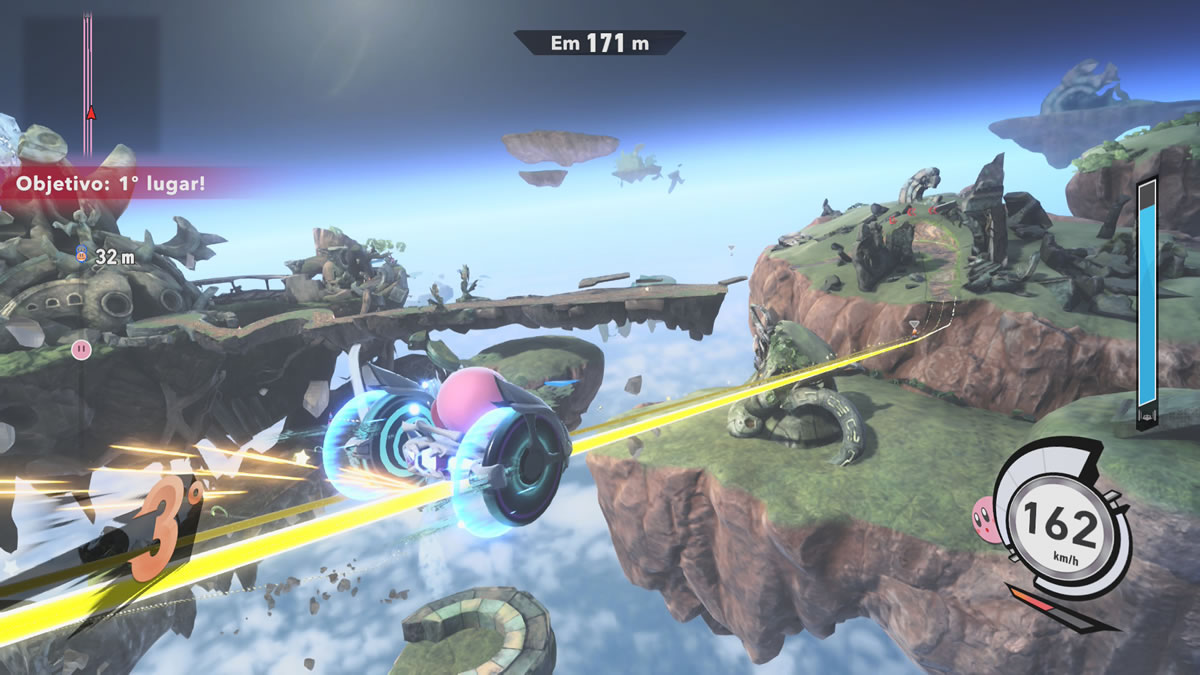 Kirby Air Riders não quer ser apenas “mais um jogo de corrida”. Ele se apresenta como um evento de disputas variadas em veículos voadores, misturando velocidade, combate, coleta de itens e desafios pouco convencionais. Há corridas tradicionais, claro, mas também provas de eliminação, batalhas, desafios contra chefes e modos que fogem completamente do esperado. Tudo isso chega ao Brasil com localização completa em português, incluindo dublagem.