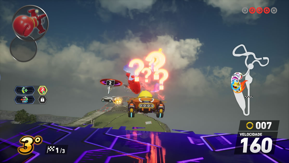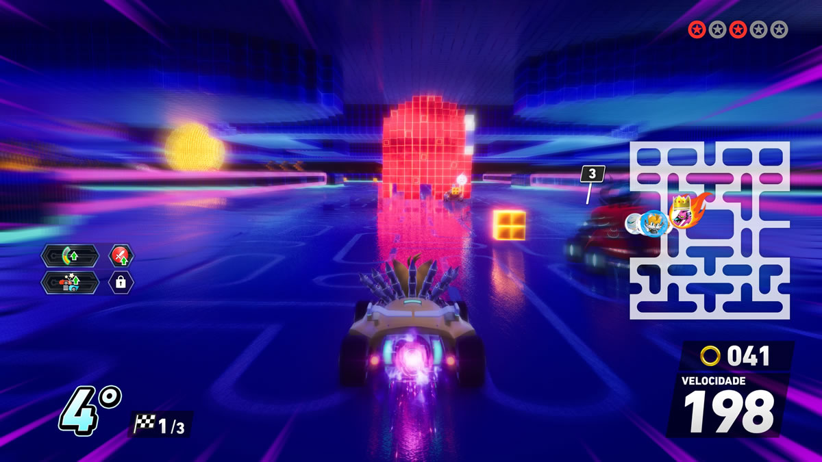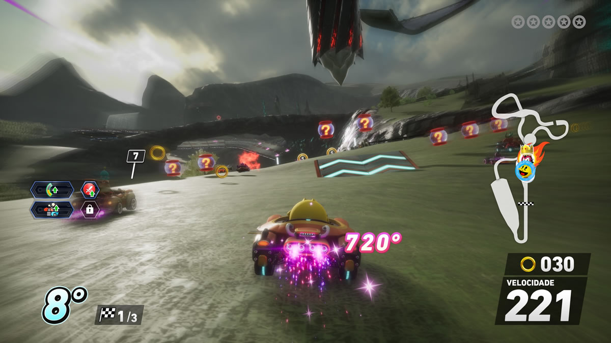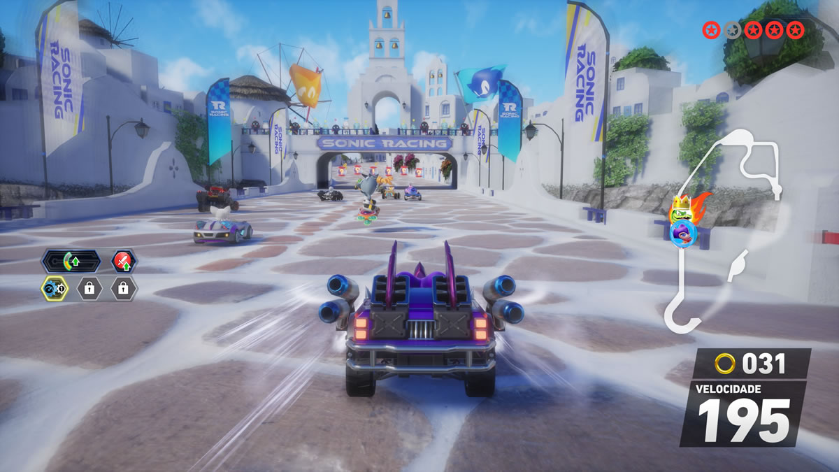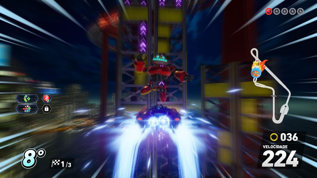 Já nas mecânicas internas, o jogo funciona melhor e dentro do esperado. Drift em três níveis, passarelas de turbo, manobras aéreas, coleta de argolas para ganho de desempenho e itens de trapaça nas categorias ataque, defesa e aceleração — tudo dentro da cartilha do gênero influenciado por Mario Kart.