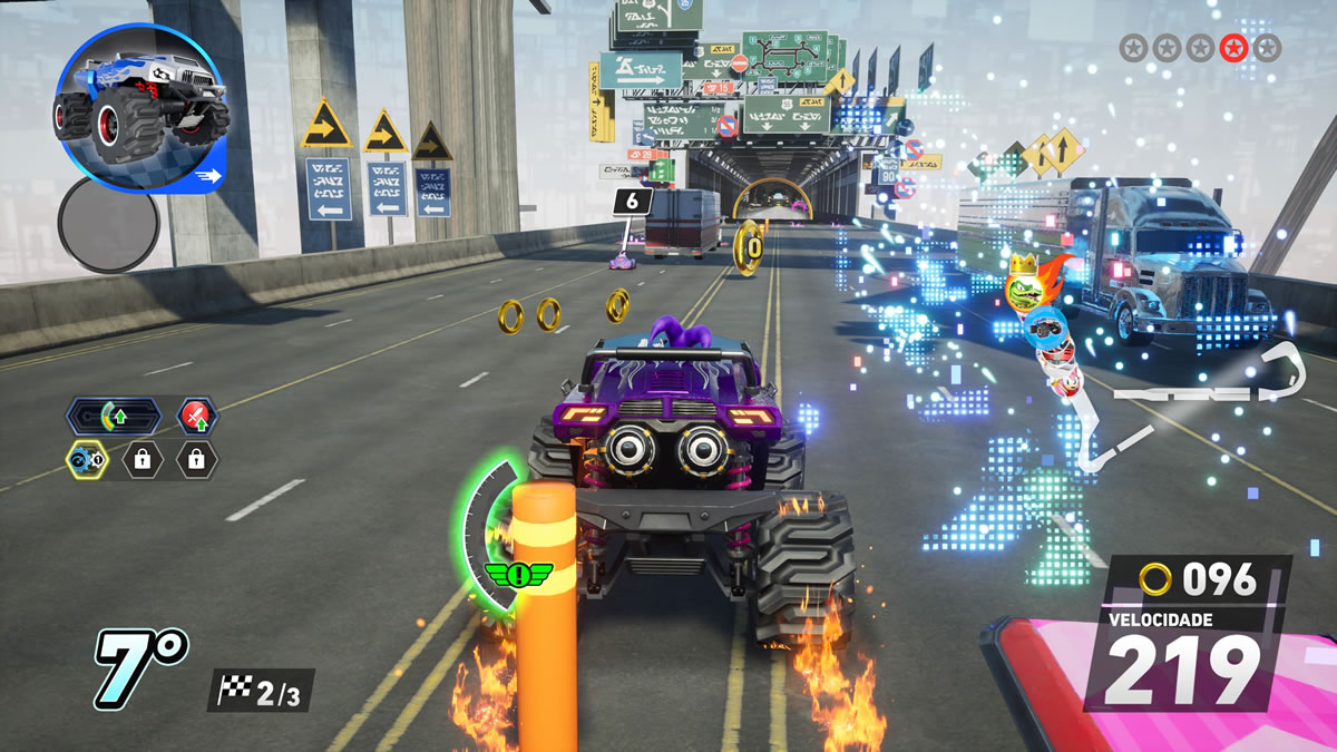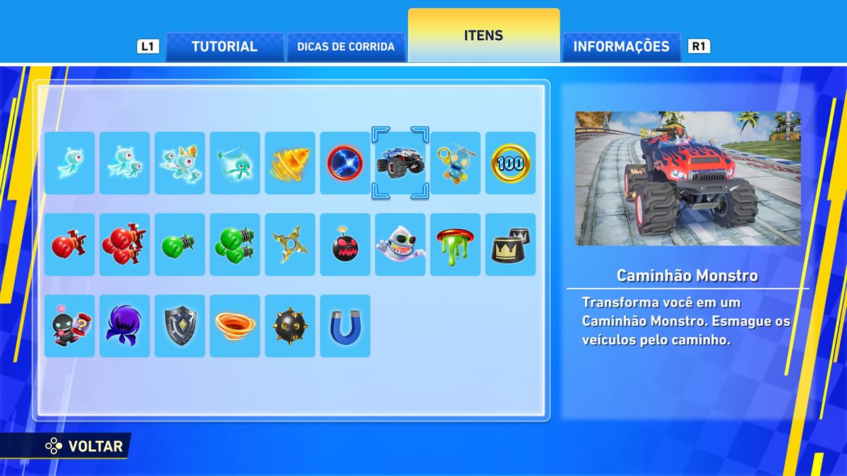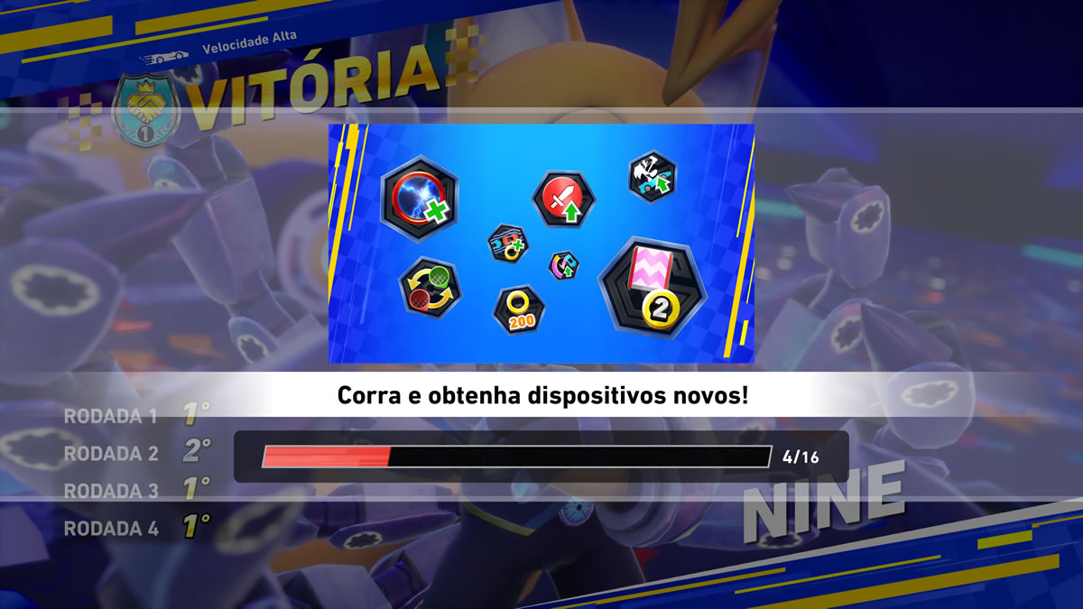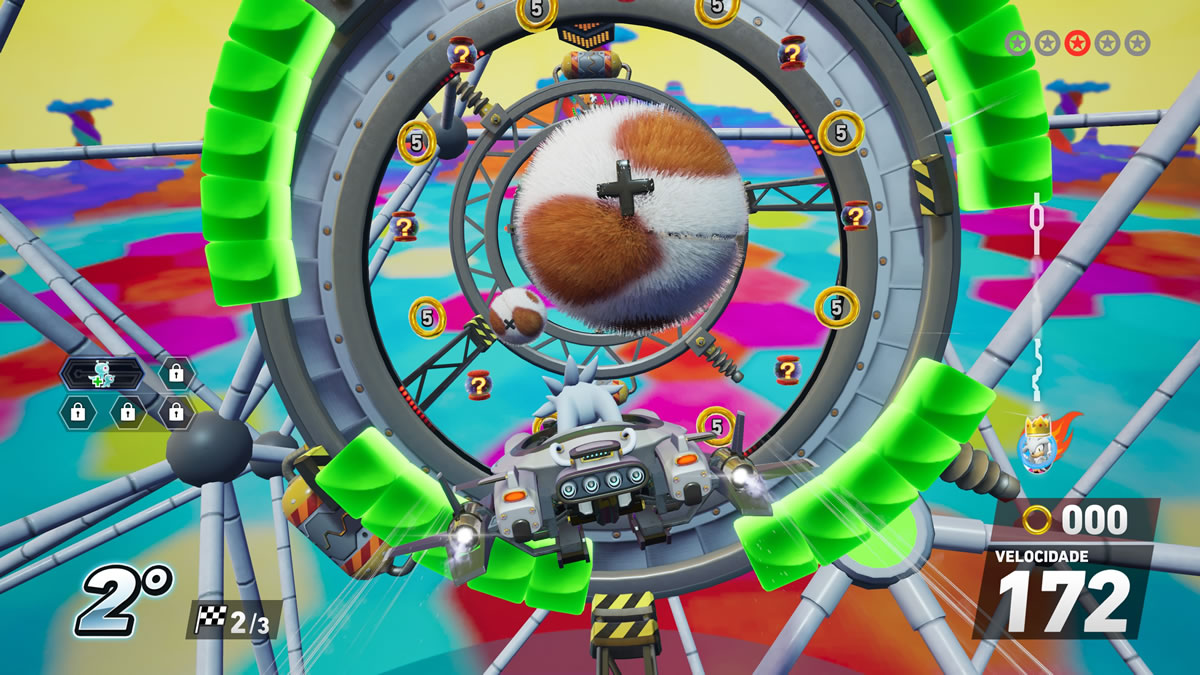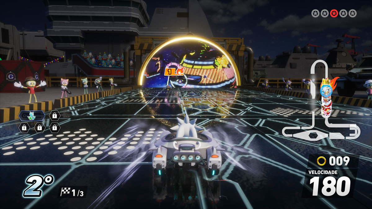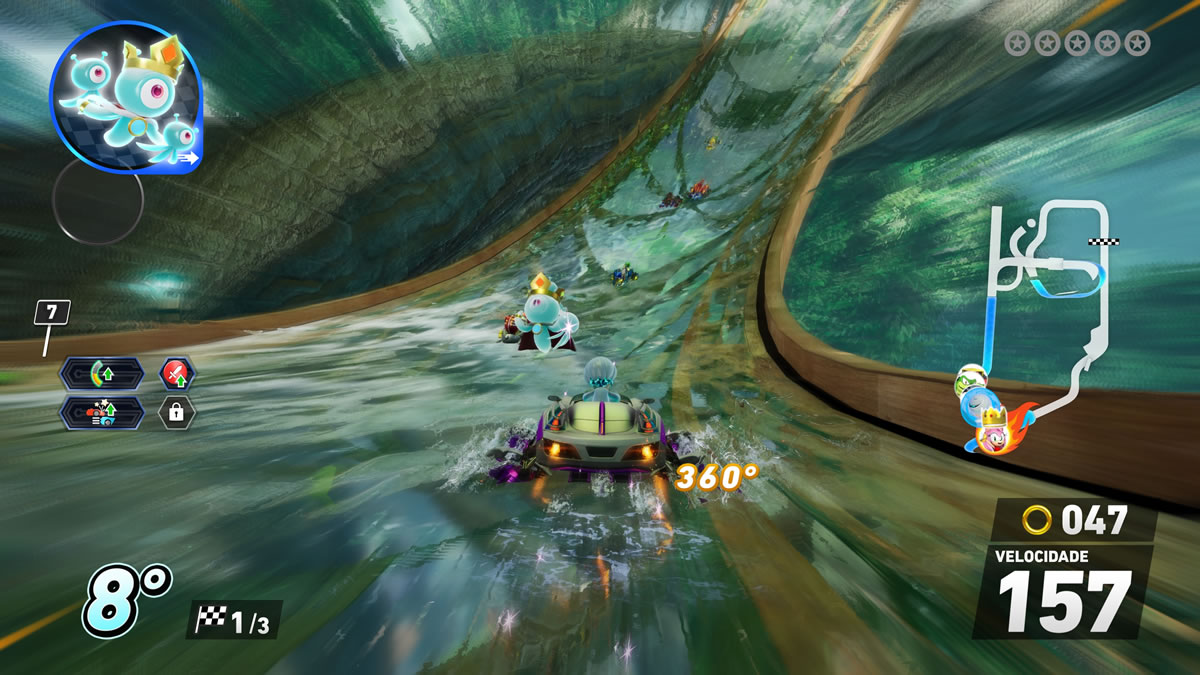 Já nas mecânicas internas, o jogo funciona melhor e dentro do esperado. Drift em três níveis, passarelas de turbo, manobras aéreas, coleta de argolas para ganho de desempenho e itens de trapaça nas categorias ataque, defesa e aceleração — tudo dentro da cartilha do gênero influenciado por Mario Kart.
