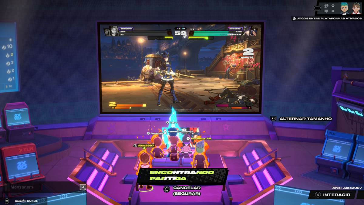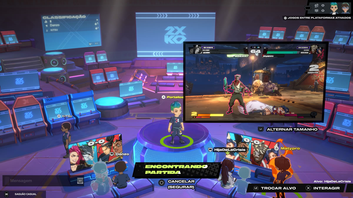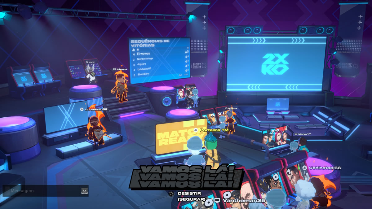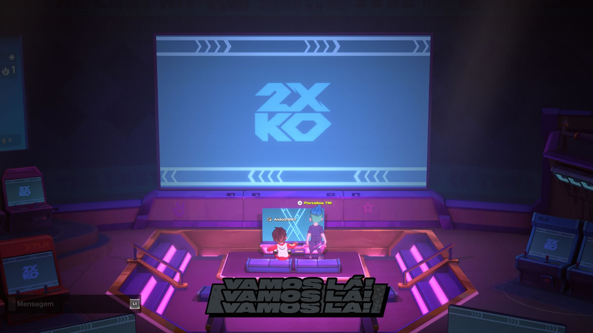A sala de matchmaking em 2XKO é de fácil compreensão: jogadores sentam em espaços reservados a duplas, assim qualquer um que sentar ao lado dará início a uma partida online. Simples, mas não tanto quanto um simples botão de “procurar partida” e automaticamente se conectar com outra pessoa — opção que também se faz presente.