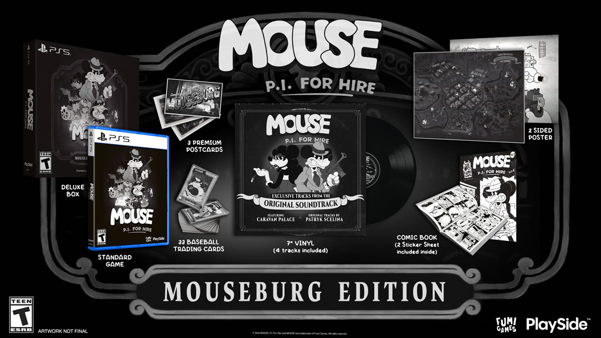 A edição padrão digital de MOUSE: P.I. For Hire será lançada em 16 de abril por US$ 29,99. Uma edição Digital Deluxe também estará disponível no Steam por US$ 39,99.