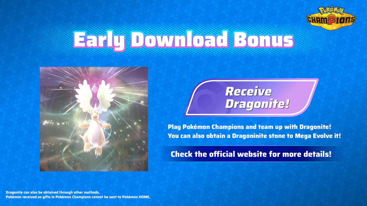 Os Treinadores que começarem a jogar Pokémon Champions até segunda-feira, 31 de agosto de 2026, receberão Dragonite e 100 Quick Coupons na caixa de entrada do jogo. Também será possível obter uma pedra Dragonite do passe de batalha da primeira temporada ao continuar jogando. Ao segurar uma pedra Dragonite, Dragonite pode Megaevoluir para Mega Dragonite.